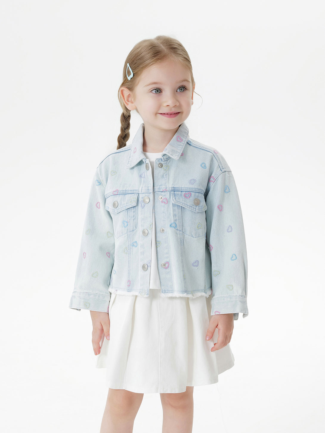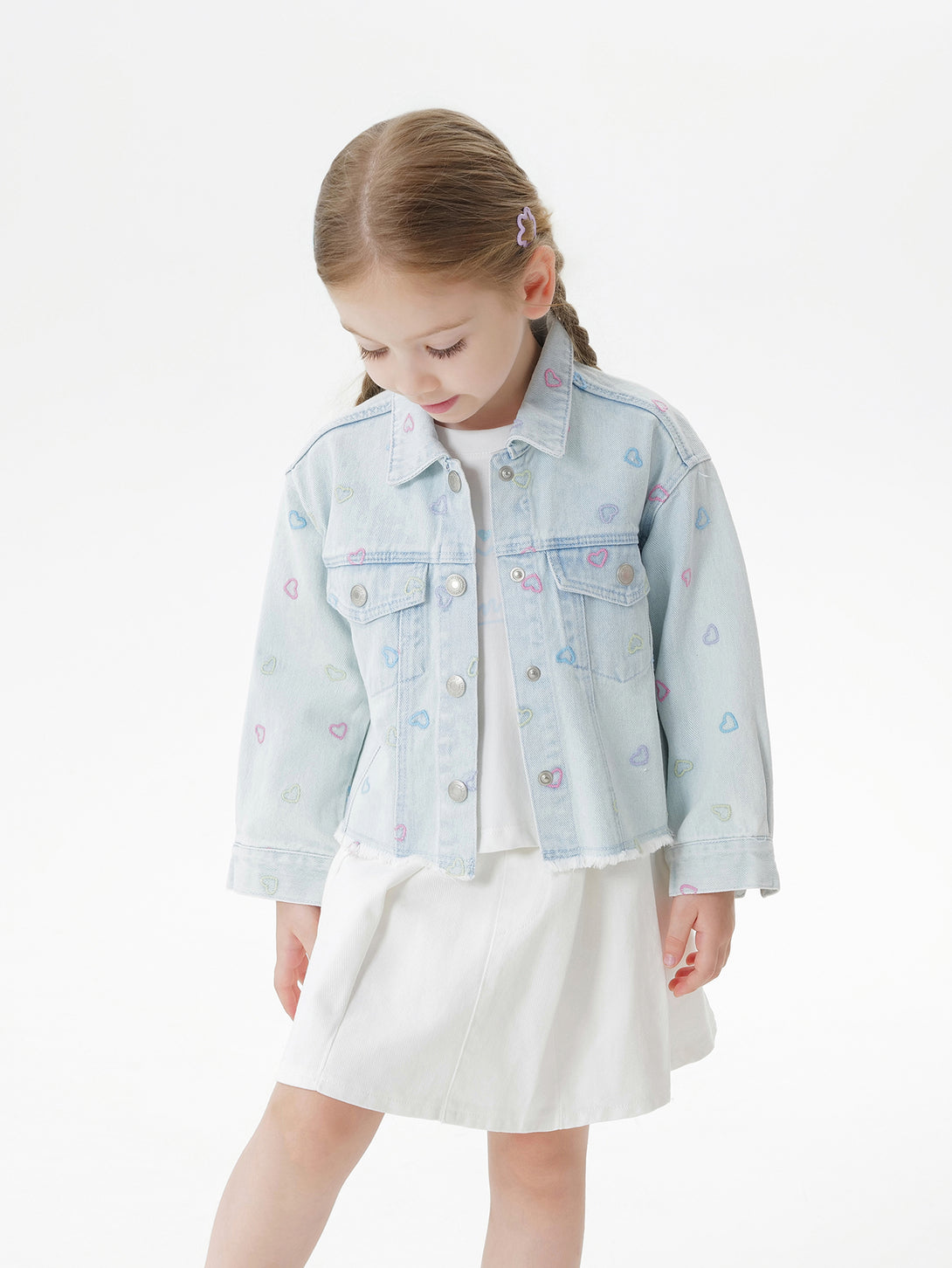 Vibrant Heart Embroidery: Features colorful heart embroidery throughout, adding a playful touch to this denim jacket